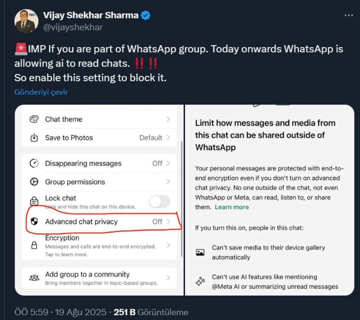 Sharma, X platformu üzerinden yaptığı paylaşımda, WhatsApp’ın artık yapay zekânın grup sohbetlerini okumasına izin verdiğini öne sürdü.