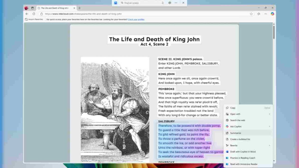 Seçilen bir metne göre Copilot ile yeni bir metin oluşturma, Word’de bir taslak başlatma, Teams toplantısı planlama ya da metni sesli okutma gibi seçenekler otomatik olarak sunuluyor.