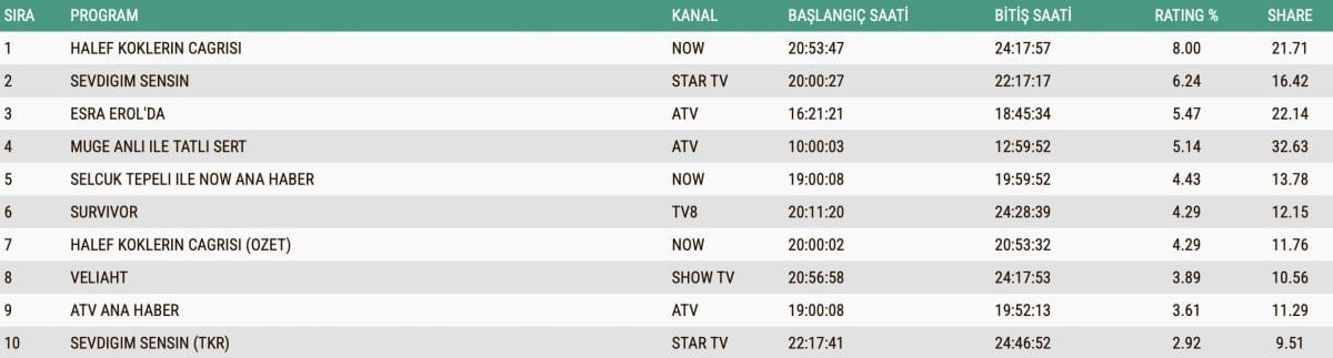 Dün akşam reyting sıralamasında her hafta olduğu gibi Halef: Köklerin Çağrısı dizisi zirvede yer aldı.