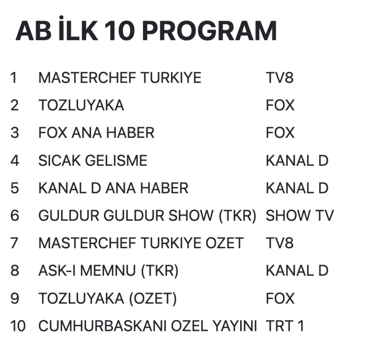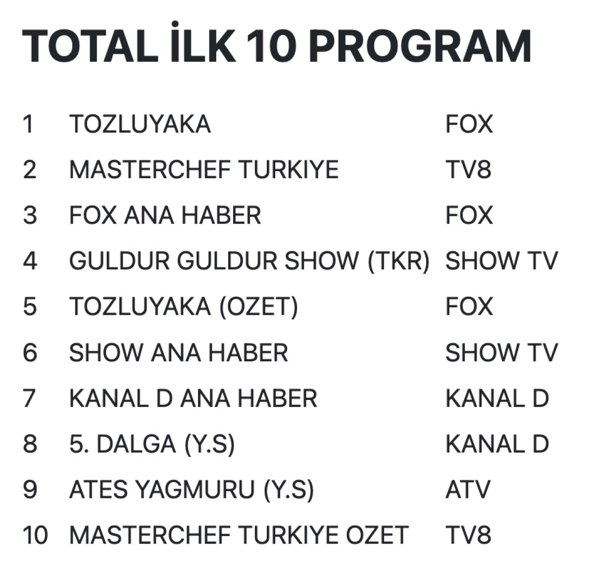 Total izleyici grubunda, birinciliği Tozluyaka, ikinciliği Masterchef Türkiye, üçüncülüğü ise Fox Ana Haber aldı.