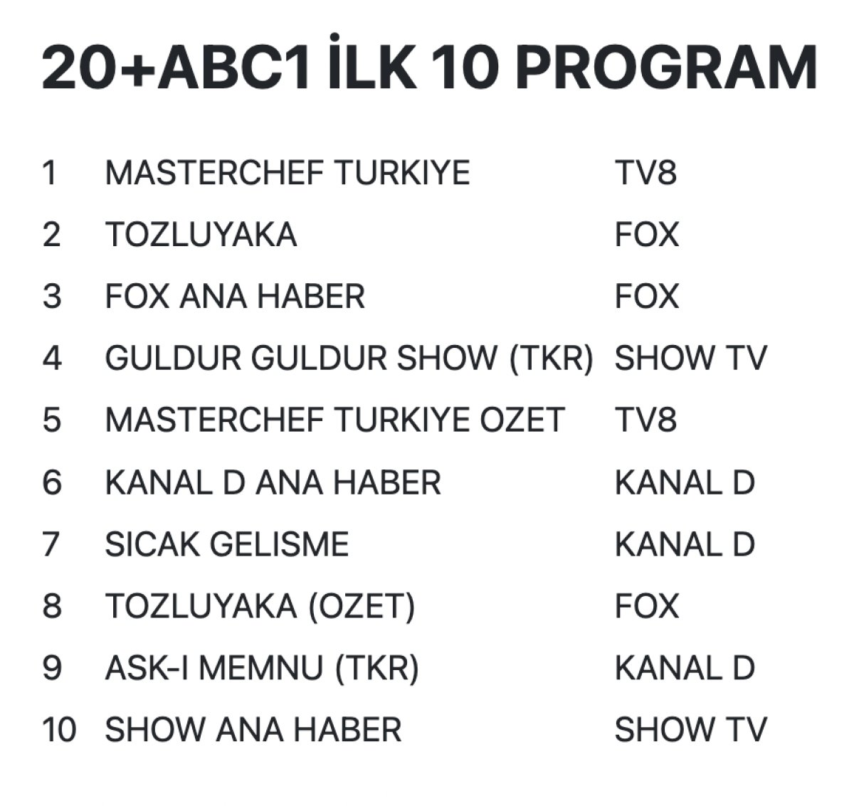 20+ABC 1 Grubunda, birinciliği Masterchef Türkiye, ikinciliği Tozluyaka, üçüncülüğü ise Fox Ana Haber aldı.
