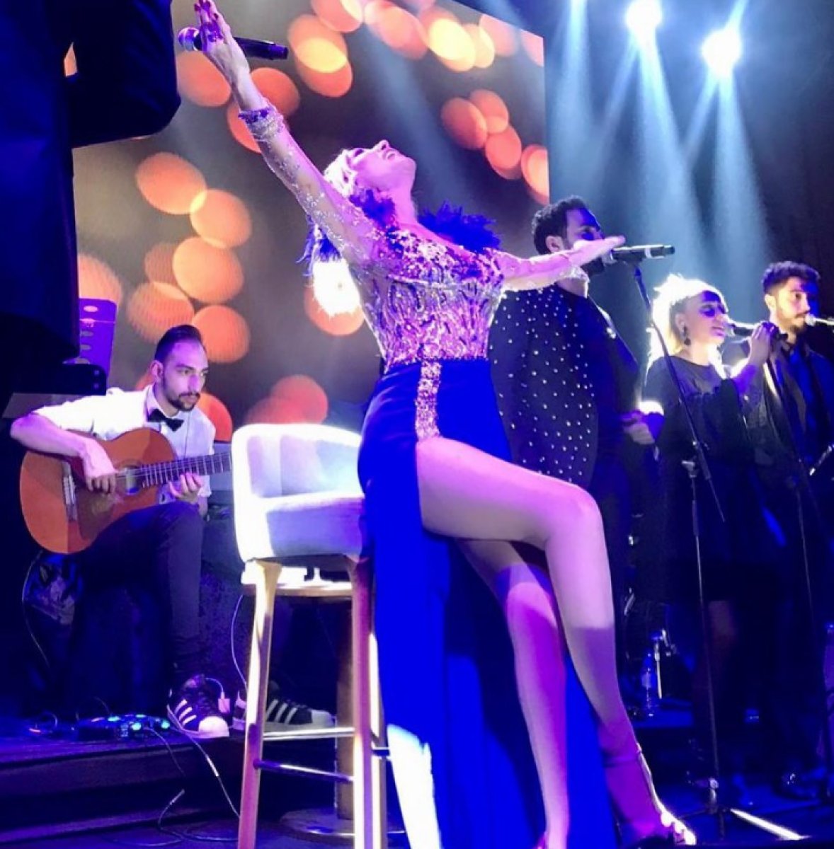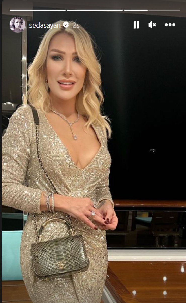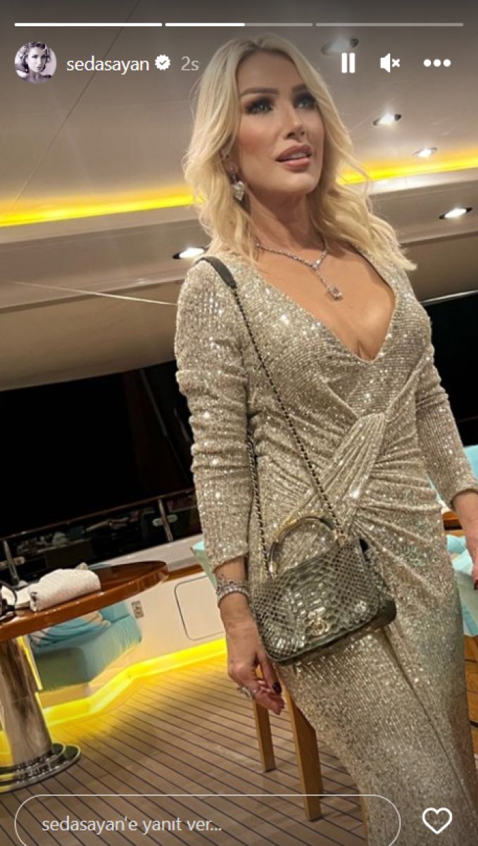 Sayan, ışıl ışıl parlayan elbisesiyle çekildiği bir pozunu takipçileriyle paylaştı.