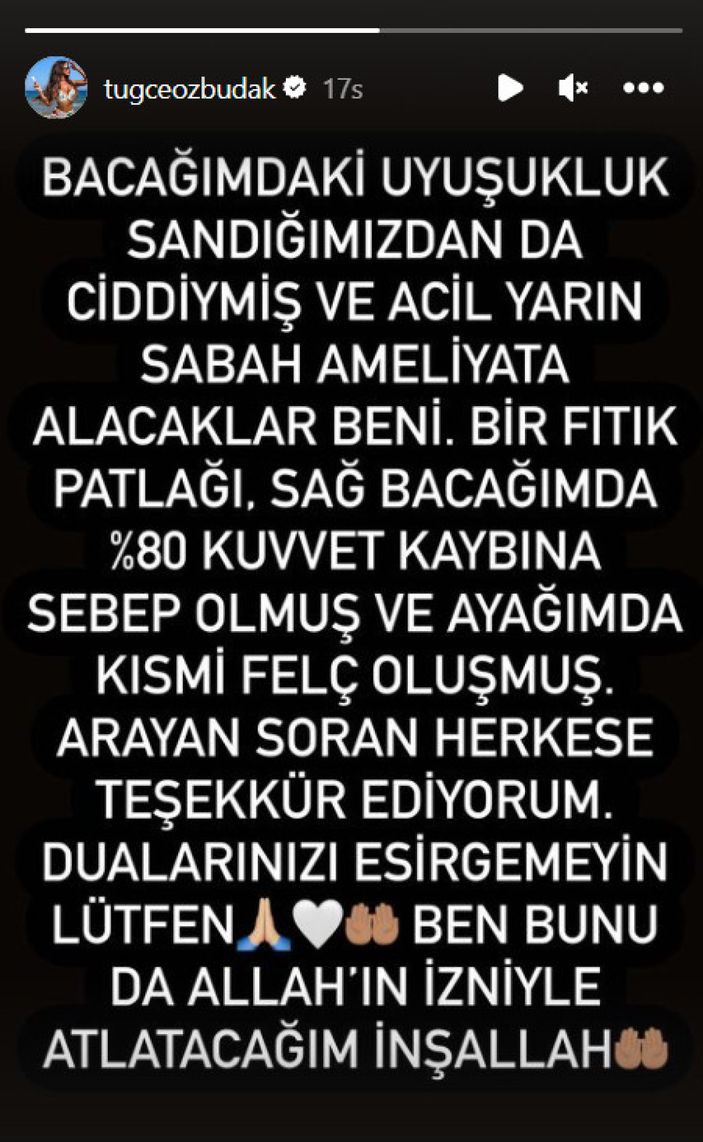 ”Bacağımdaki uyuşukluk sandığımızdan da ciddiymiş ve acil yarın sabah ameliyata alacaklar beni. Bir fıtık patlağı. Sağ bacağımda %80 kuvvet kaybına sebep olmuş ve ayağımda kısmi felç oluşmuş. Arayan soran herkese teşekkür ediyorum. Dualarınızı esirgemeyin lütfen. Ben bunu da Allah’ın izniyle atlatacağım inşallah.”