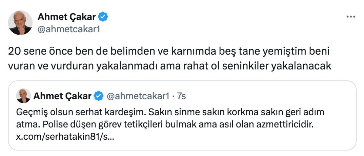 Serhat Akın’a yapılan silahlı saldırıya tepkiler çığ gibi büyürken bir paylaşımda Ahmet Çakar’dan geldi.