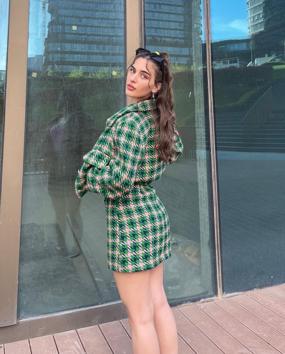 Ceketi ve mini eteği ile kamera karşısına geçen Çağla Şimşek, peş peşe cesur pozlar verdi.