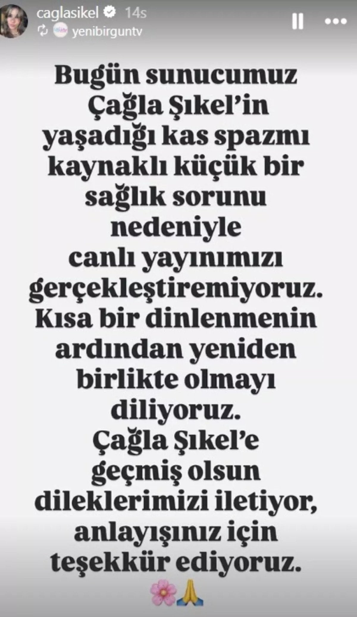 Yapılan açıklamada; “Bugün sunucumuz Çağla Şıkel’in yaşadığı kas spazmı kaynaklı küçük bir sağlık sorunu nedeniyle canlı yayınımızı gerçekleştiremiyoruz. Kısa bir dinlenmenin ardından yeniden birlikte olmayı diliyoruz. Çağla Şıkel’e geçmiş olsun dileklerimizi iletiyor, anlayışınız için teşekkür ediyoruz.” ifadelerine yer verildi.
