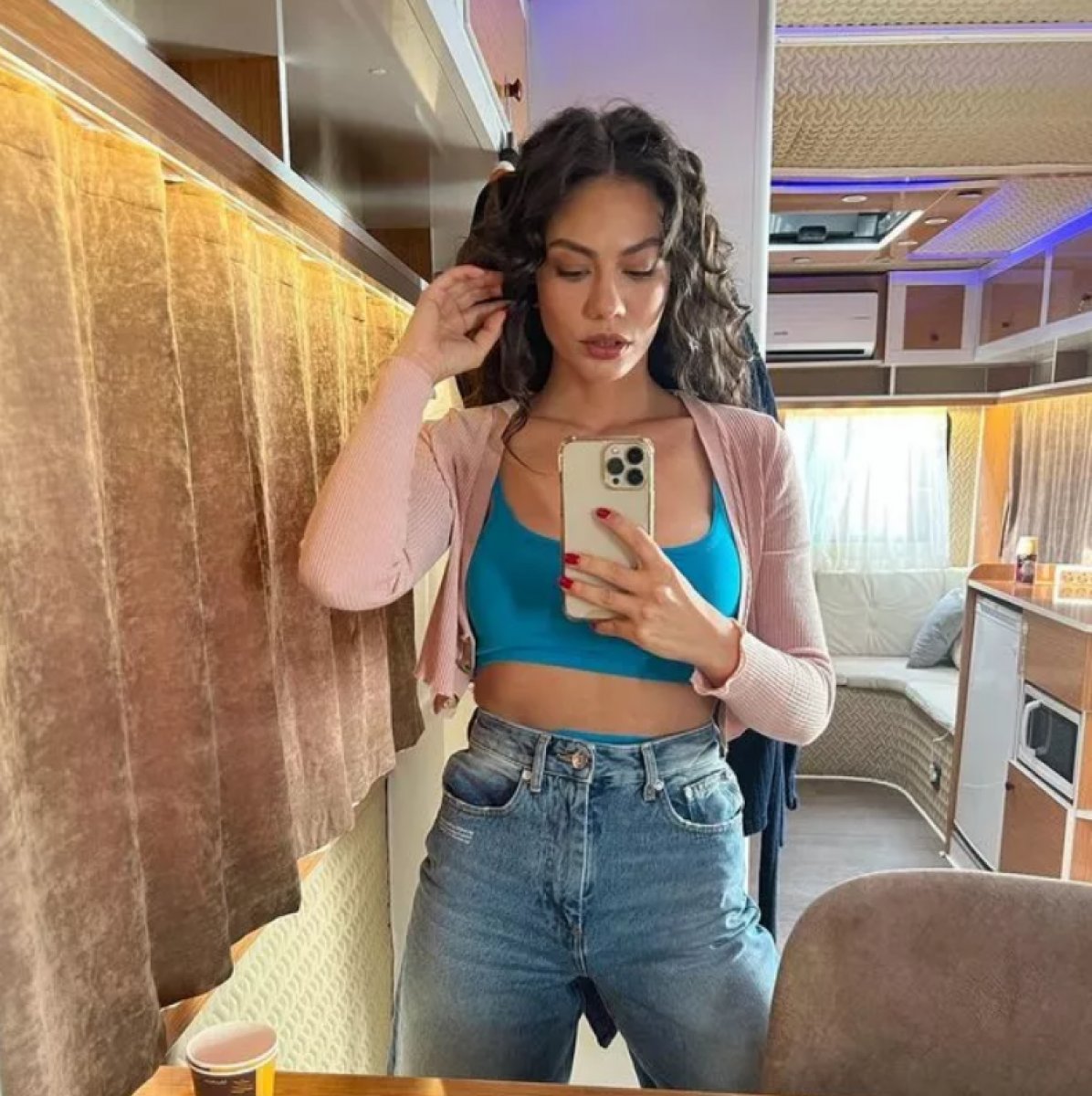 Göğüs dekolteli ve göbeği açık kombiniyle ayna pozu veren Demet Özdemir, sosyal medyayı adeta kasıp kavurdu.