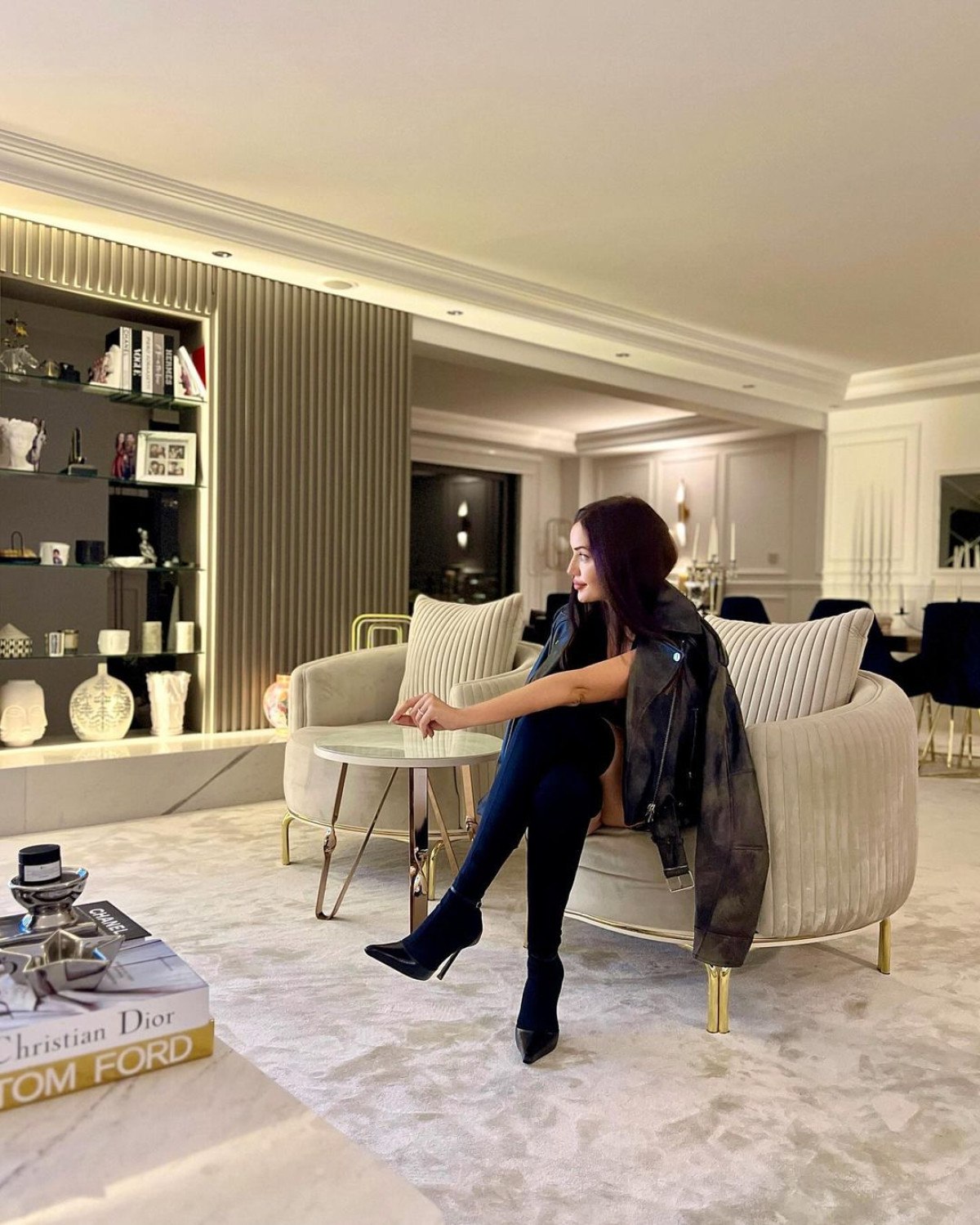 Evcen’in evinin salonunda verdiği pozlar, dekorasyonu ve lüksü gözler önüne serdi.