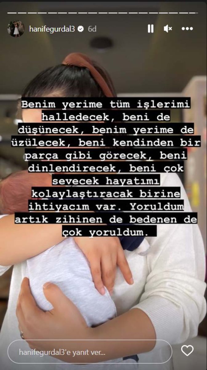 Hanife Gürdal paylaşımında “Benim yerime tüm işlerimi halledecek, beni de düşünecek, benim yerime de üzülecek, beni kendinden bir parça olarak görecek, dinlendirecek, beni çok sevecek hayatımı kolaylaştıracak birine ihtiyacım var. Yoruldum artık zihnen de bedenen de çok yoruldum.” sözlerine yer verdi.