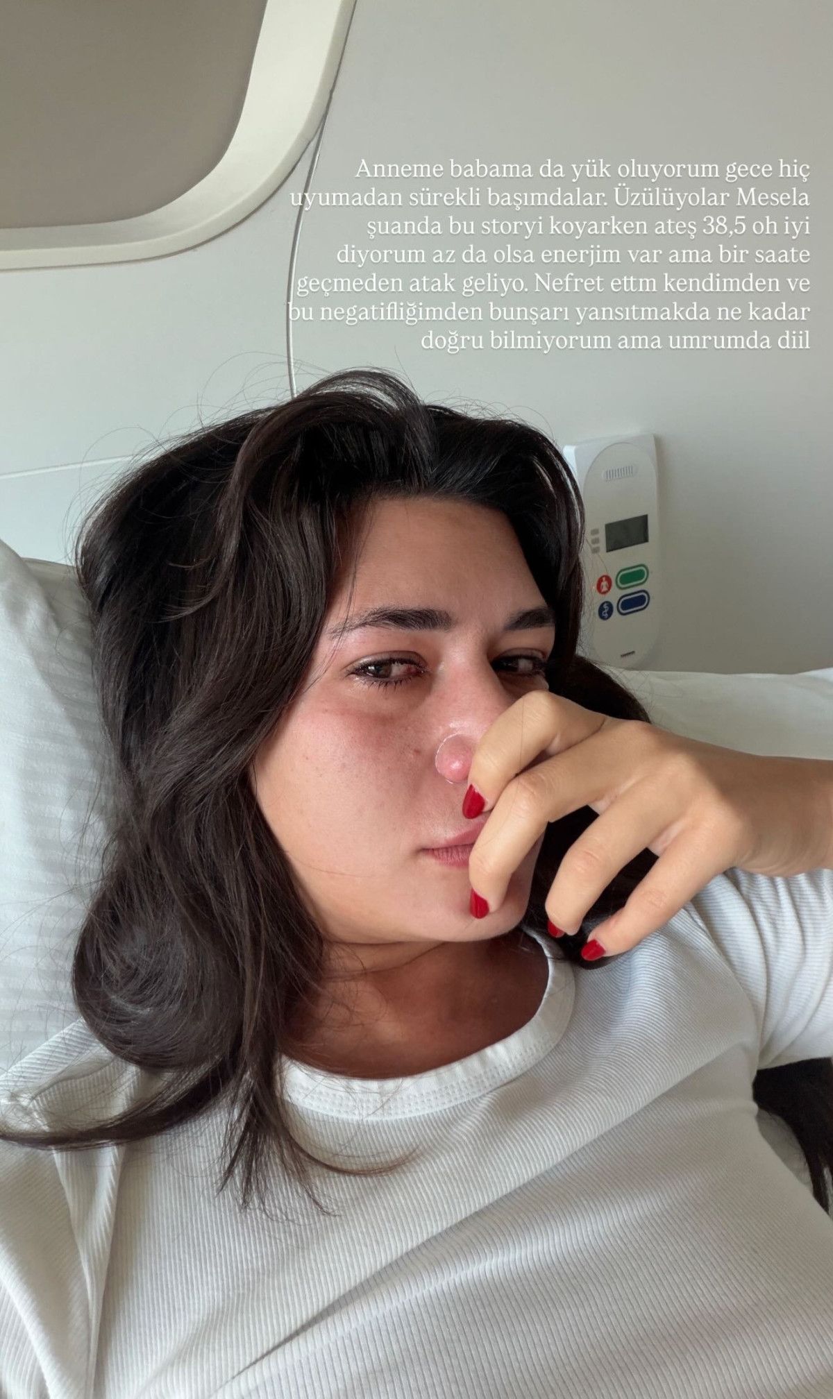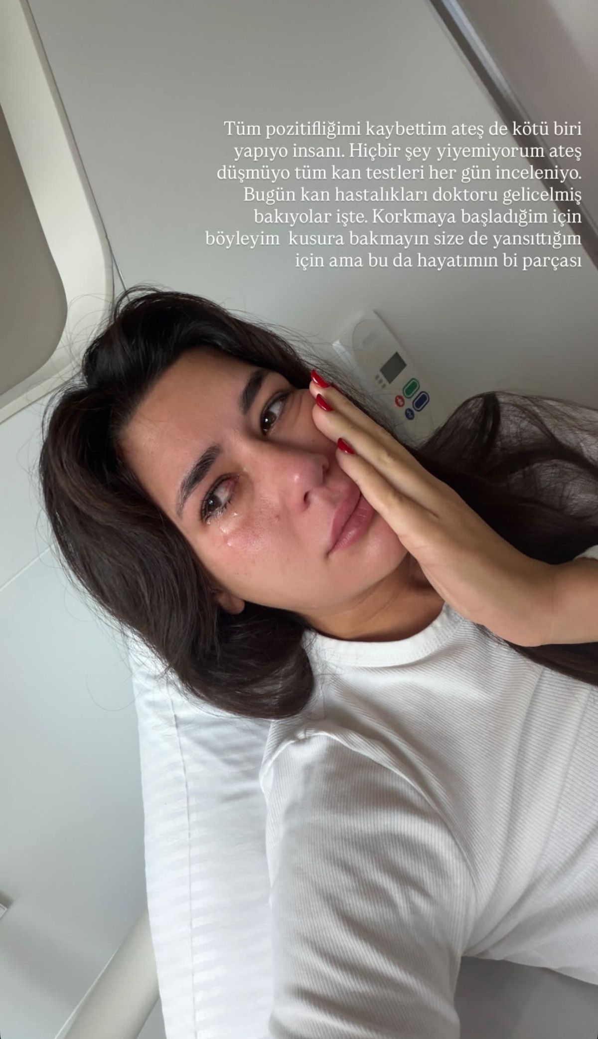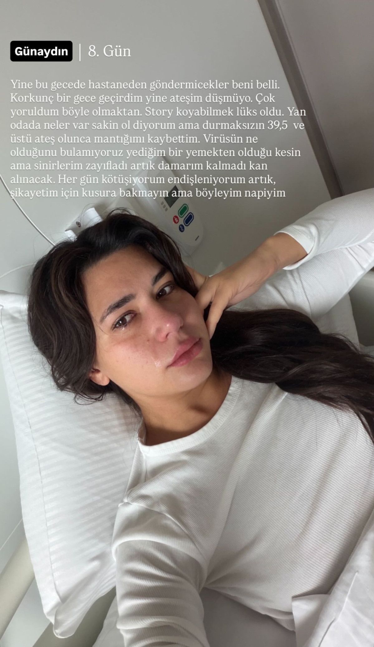 “Yine bu gecede hastaneden göndermeyecekler beni belli. Korkunç bir gece geçirdim yine, ateşim düşmüyor. Çok yoruldum böyle olmaktan. Story koyabilmek lüks oldu. Yan odada neler var sakin ol diyorum ama durmaksızın 39,5 ve üstü ateş olunca mantığımı kaybettim. Virüsün ne olduğunu bulamıyoruz, yediğim bir yemekten olduğu kesin ama sinirlerim zayıfladı, artık damarım kalmadı kan alınacak. Her gün kötüleşiyorum, endişeleniyorum artık, şikayetim için kusura bakmayın ama böyleyim, napıyım.”