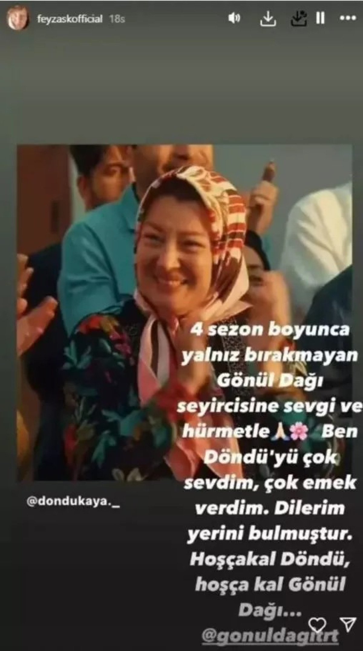 Oyuncu ayrılık haberini “4 sezon boyunca yalnız bırakmayan Gönül Dağı seyircisine sevgi ve hürmetle. Ben Döndü’yü çok sevdim, çok emek verdim. Dilerim yerini bulmuştur. Hoşça kal Döndü, hoşça kal Gönül Dağı” ifadeleriyle duyurdu.
