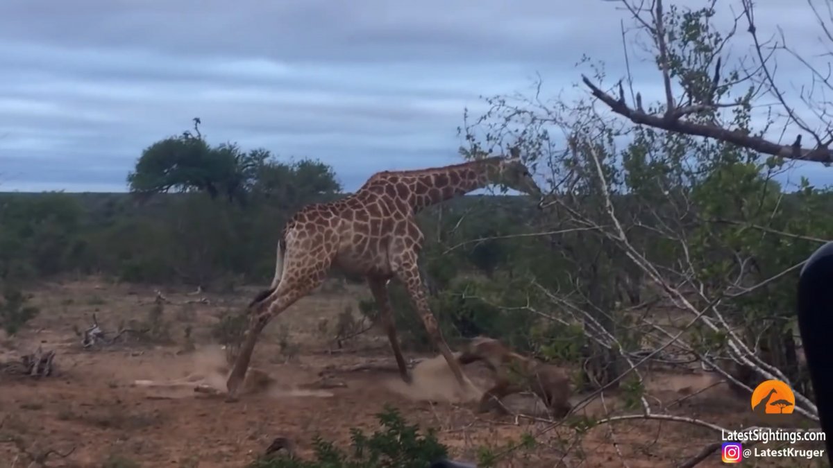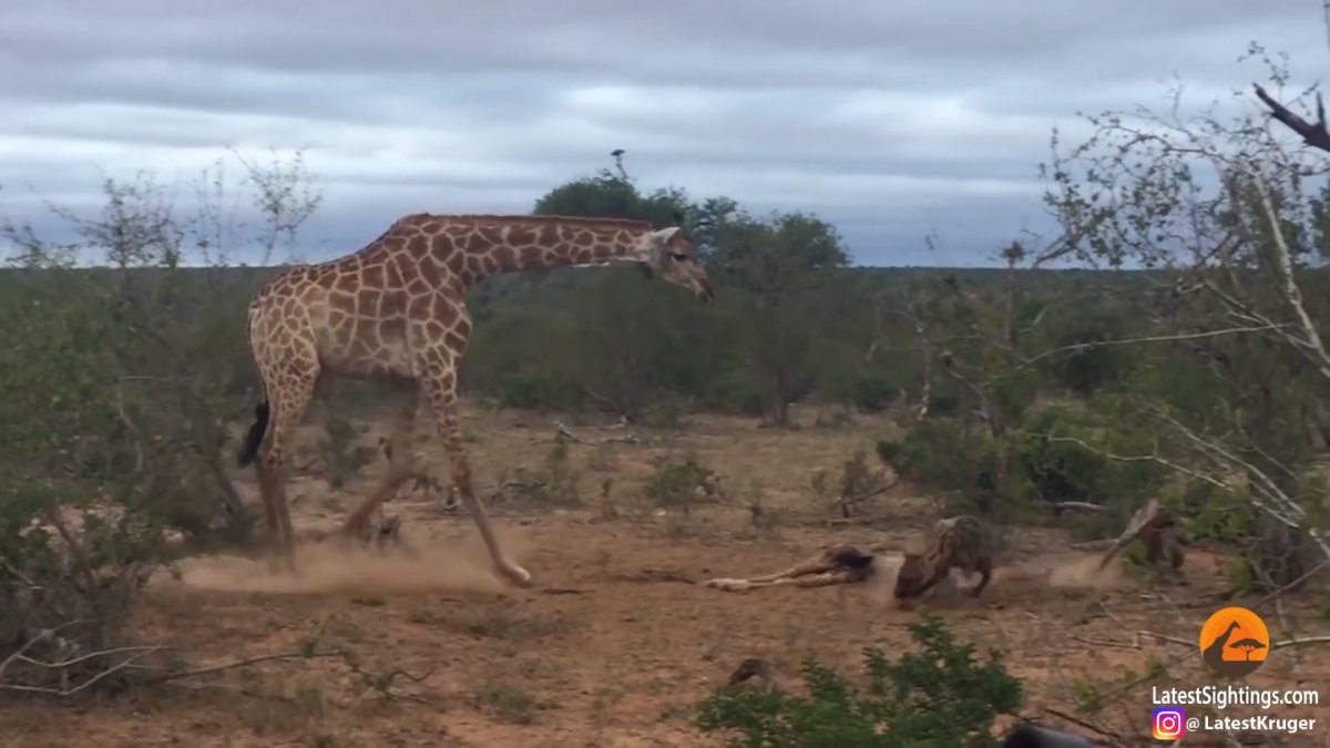 Anne zürafa, sayıca üstün olmalarına rağmen sırtlara tekmelerle saldırdı. Öldürücü tekmelerden kaçan sırtlanlar, annenin mücadelesine yenik düştü.