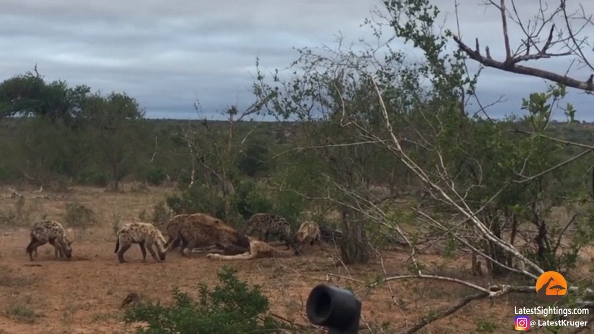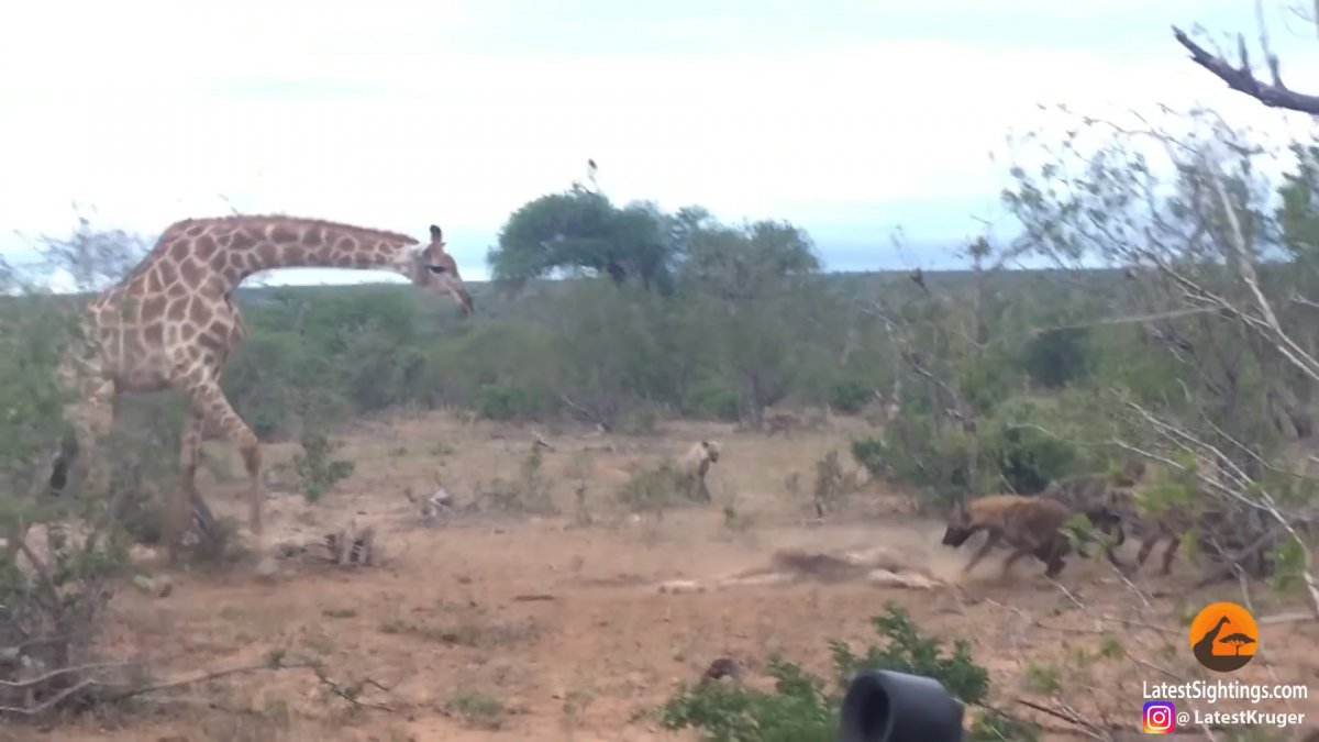 Kruger Ulusal Parkı’nda ölü yavru zürafanın etrafını saran sırtlanlar, büyük bir mücadele ile karşı karşıya kaldı.