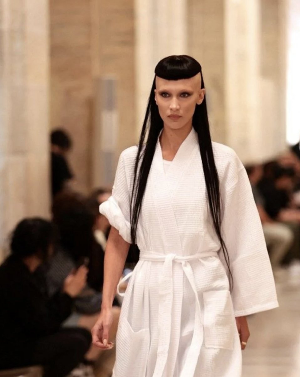 Kız kardeşi Bella’ya podyumda eşlik eden Gigi ise alışık sarı saçları yerine siyah ve kaküllü saç modeliyle defile yürüdü.
