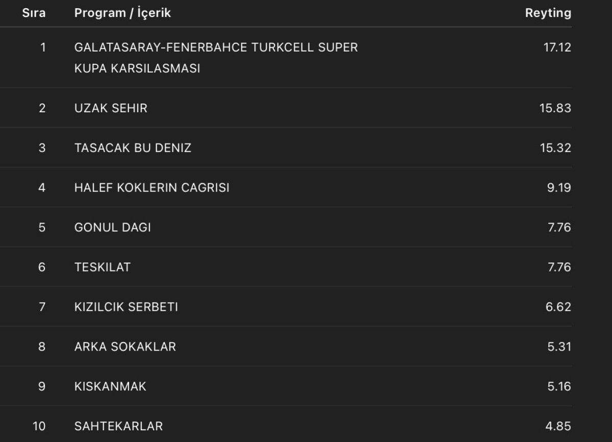 Geçtiğimiz hafta Galatasaray ve Fenerbahçe arasında oynanan Süper Kupa final maçı reytinglerde zirveye yerleşti.