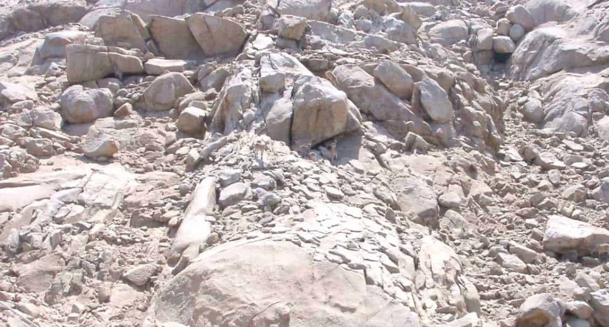 Bölgede dağılmış kaya parçalarının bulunduğu kayalık bir tepe görülmektedir.