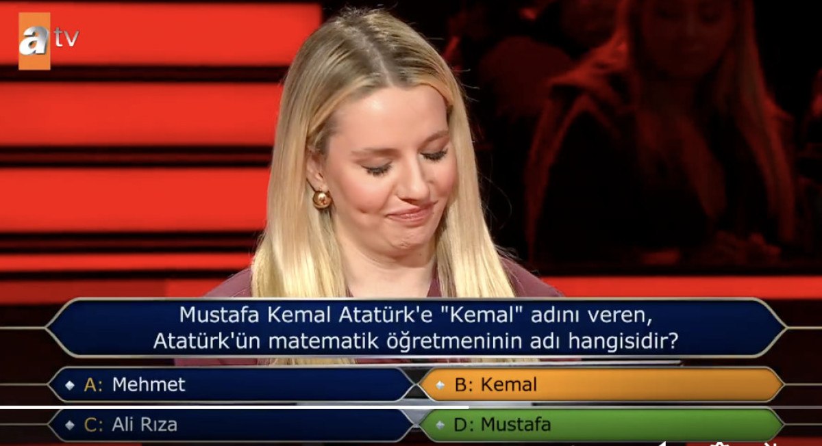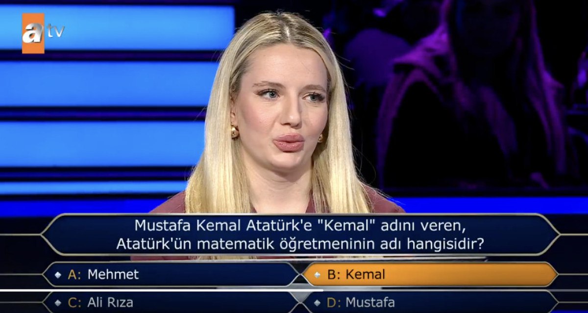 “Kim Milyoner Olmak İster” yarışmasında sunucu Oktay Kaynarca’nın yönelttiği “Mustafa Kemal Atatürk’e ‘Kemal’ adını veren matematik öğretmeninin adı hangisidir?” sorusuna doğru yanıtı veremedi.