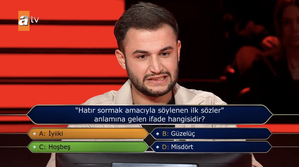 Yarışmacını karşısına ikinci soruda, “Hatır sormak amacıyla söylenen ilk sözler anlamına gelen ifade hangisidir?” sorusu çıktı.