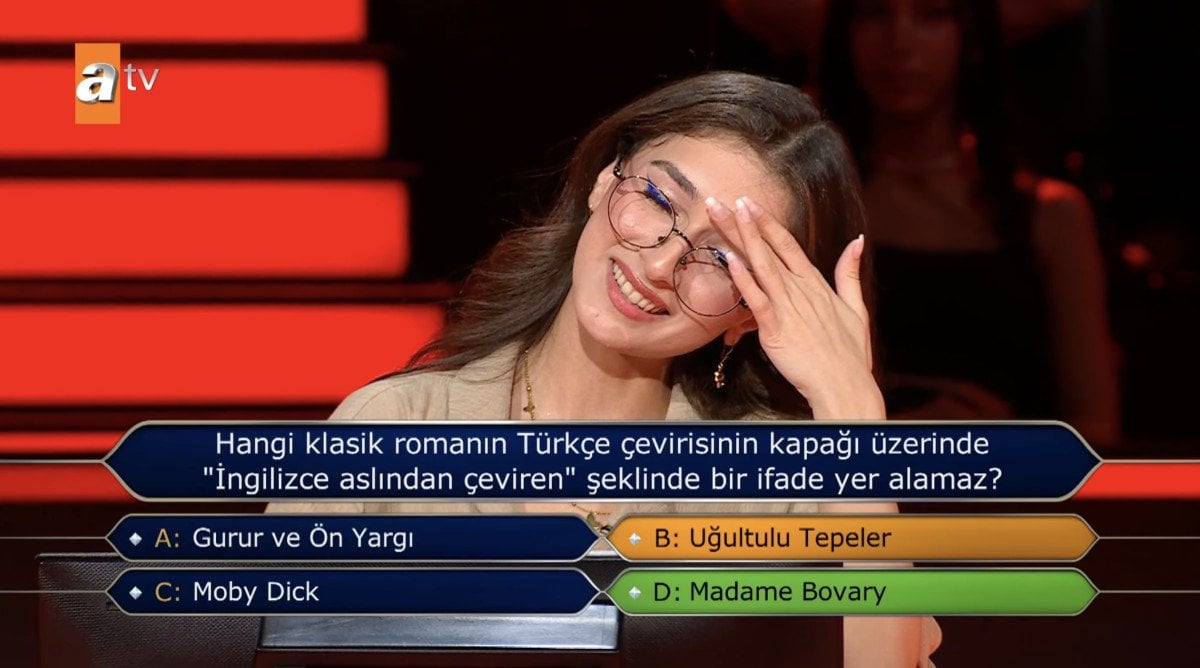Gürer’e “Hangi klasik romanın Türkçe çevirisini kapağı üzerinde “İngilizce aslından çeviren” şeklinde bir ifade yer alamaz?” sorusu soruldu.