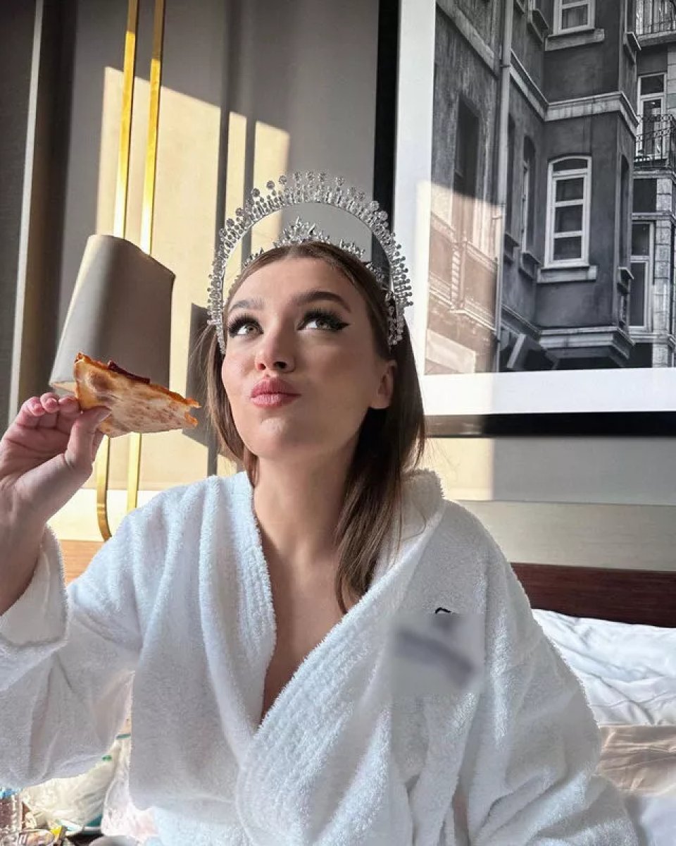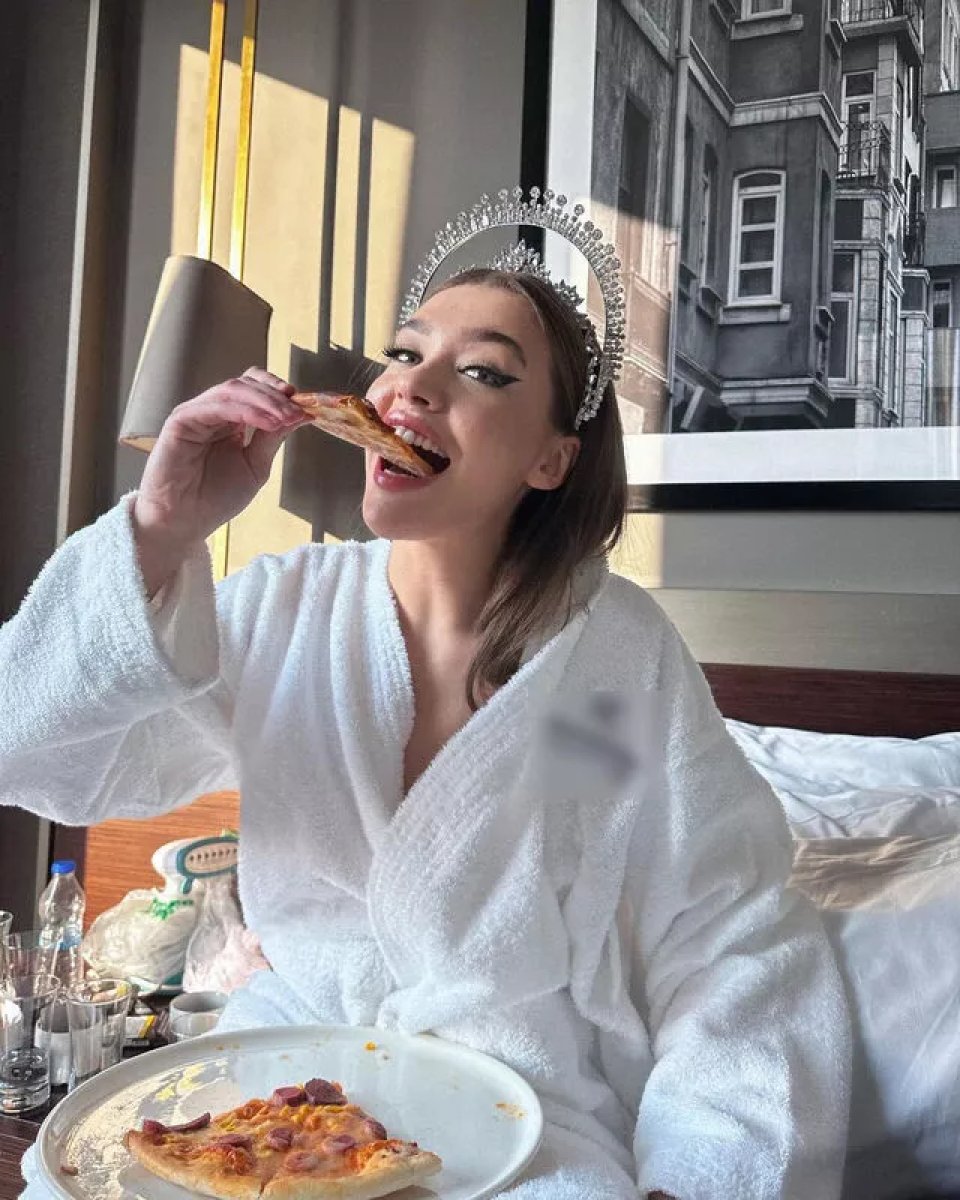 Melisa Döngel yatakta pizza yerken poz verdi. Bornozlu halleri kameraya yansıyan Döngel’e beğeni ve yorum yağdı.