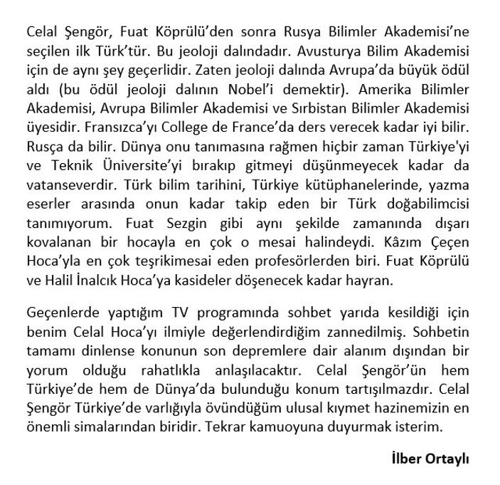 Sohbetin tamamı dinlense mevzunun son zelzelelere dair alanım dışından bir yorum olduğu rahatlıkla anlaşılacaktır. Celal Şengör’ün hem Türkiye’de hem de Dünya’da bulunduğu pozisyon tartışılmazdır. Celal Şengör, Türkiye’de varlığıyla övündüğüm ulusal değer hazinemizin en kıymetli simalarından biridir. Tekrar kamuoyuna duyurmak isterim.