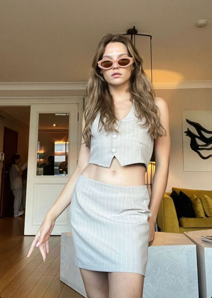 Gri çizgili bir takım giyen Nilsu Berfin Aktaş, verdiği iddialı pozları takipçilerinin beğenisine sundu.