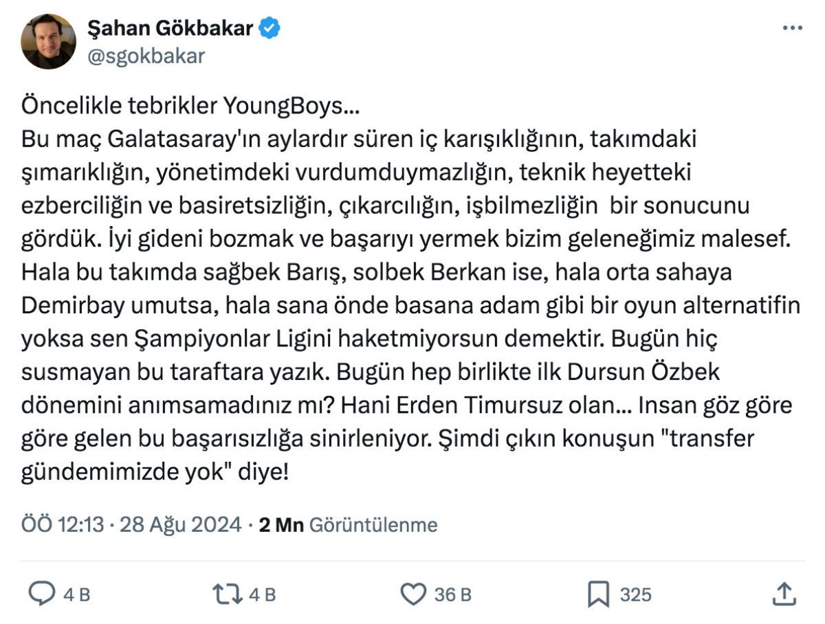 “Öncelikle tebrikler Young Boys… Bu maç Galatasaray’ın aylardır süren iç karışıklığının, takımdaki şımarıklığın, yönetimdeki vurdumduymazlığın, teknik heyetteki ezberciliğin ve basiretsizliğin, çıkarcılığın, işbilmezliğin bir sonucunu gördük. İyi gideni bozmak ve başarıyı yermek bizim geleneğimiz malesef. Hala bu takımda sağ bek Barış, sol bek Berkan ise, hala orta sahaya Demirbay umutsa, hala sana önde basana adam gibi bir oyun alternatifin yoksa sen Şampiyonlar Ligi’ni haketmiyorsun demektir. Bugün hiç susmayan bu taraftara yazık. Bugün hep birlikte ilk Dursun Özbek dönemini anımsamadınız mı? Hani Erden Timursuz olan… İnsan göz göre göre gelen bu başarısızlığa sinirleniyor. Şimdi çıkın konuşun “Transfer gündemimizde yok” diye!”