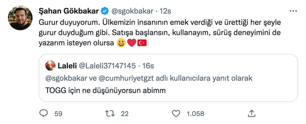 Şahan Gökbakar “TOGG için ne düşünüyorsun abim” sorusu soran bir takipçisine “Gurur duyuyorum. Ülkemizin insanının emek verdiği ve ürettiği her şeyle gurur duyduğum gibi. Satışa başlansın, kullanayım, sürüş deneyimini de yazarım isteyen olursa” yanıtını verdi.
