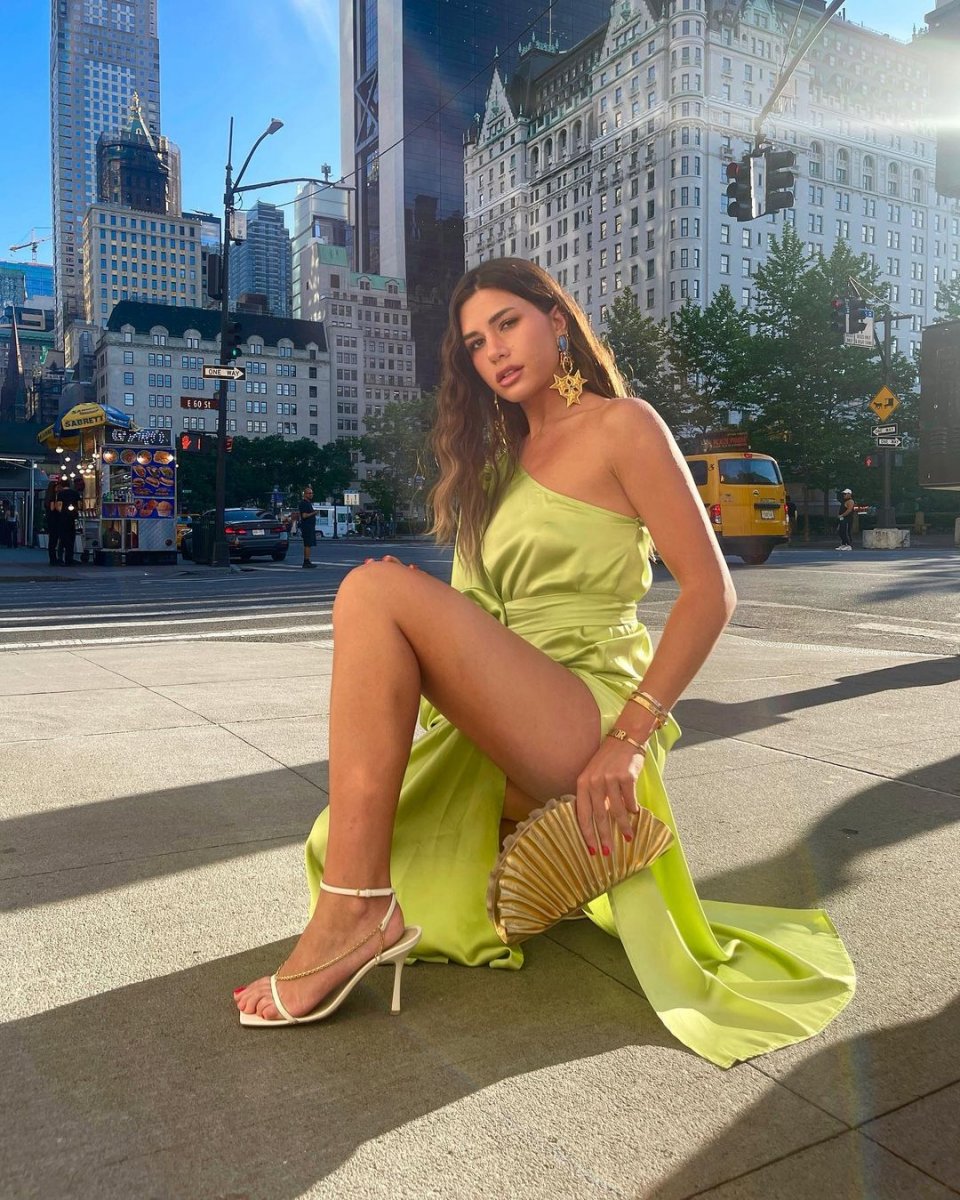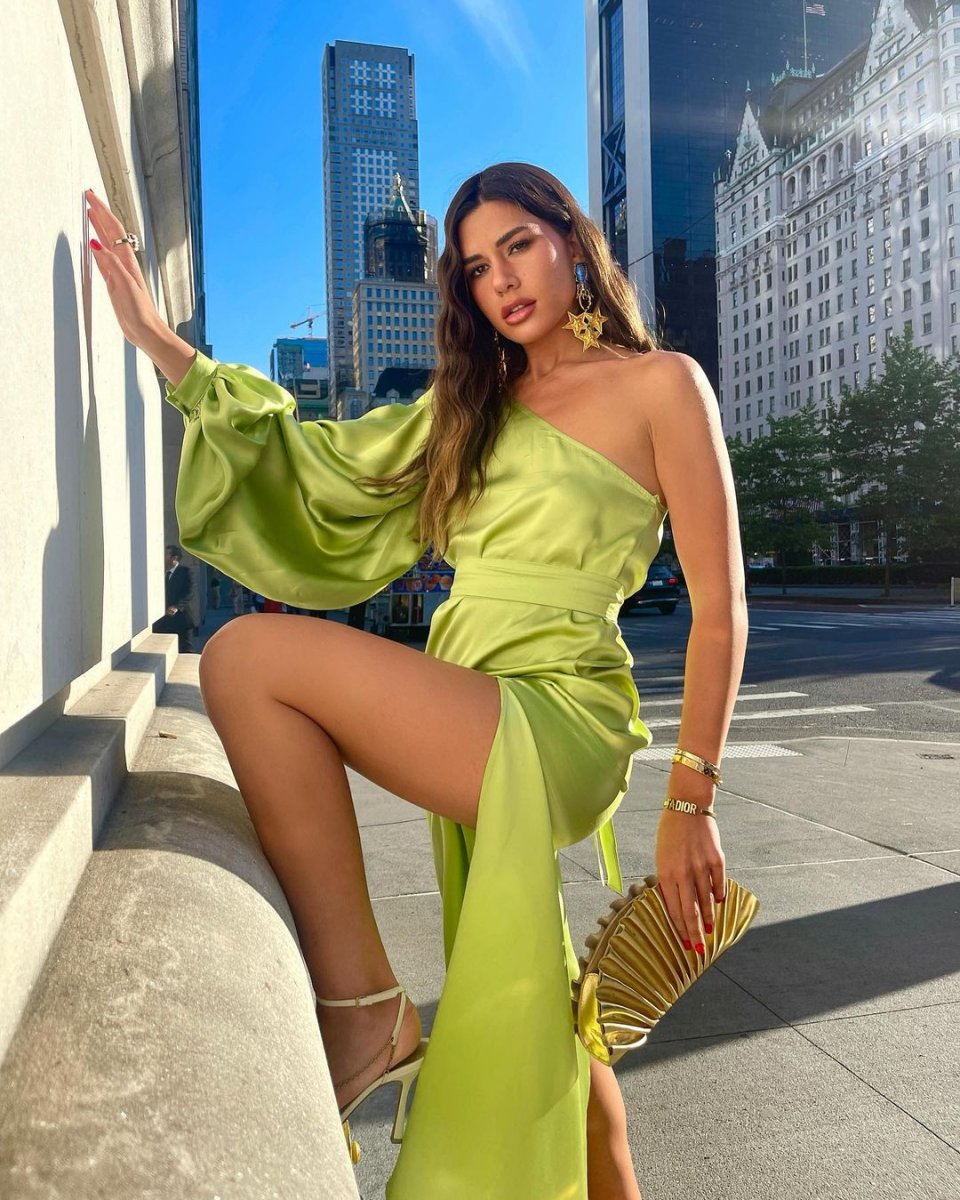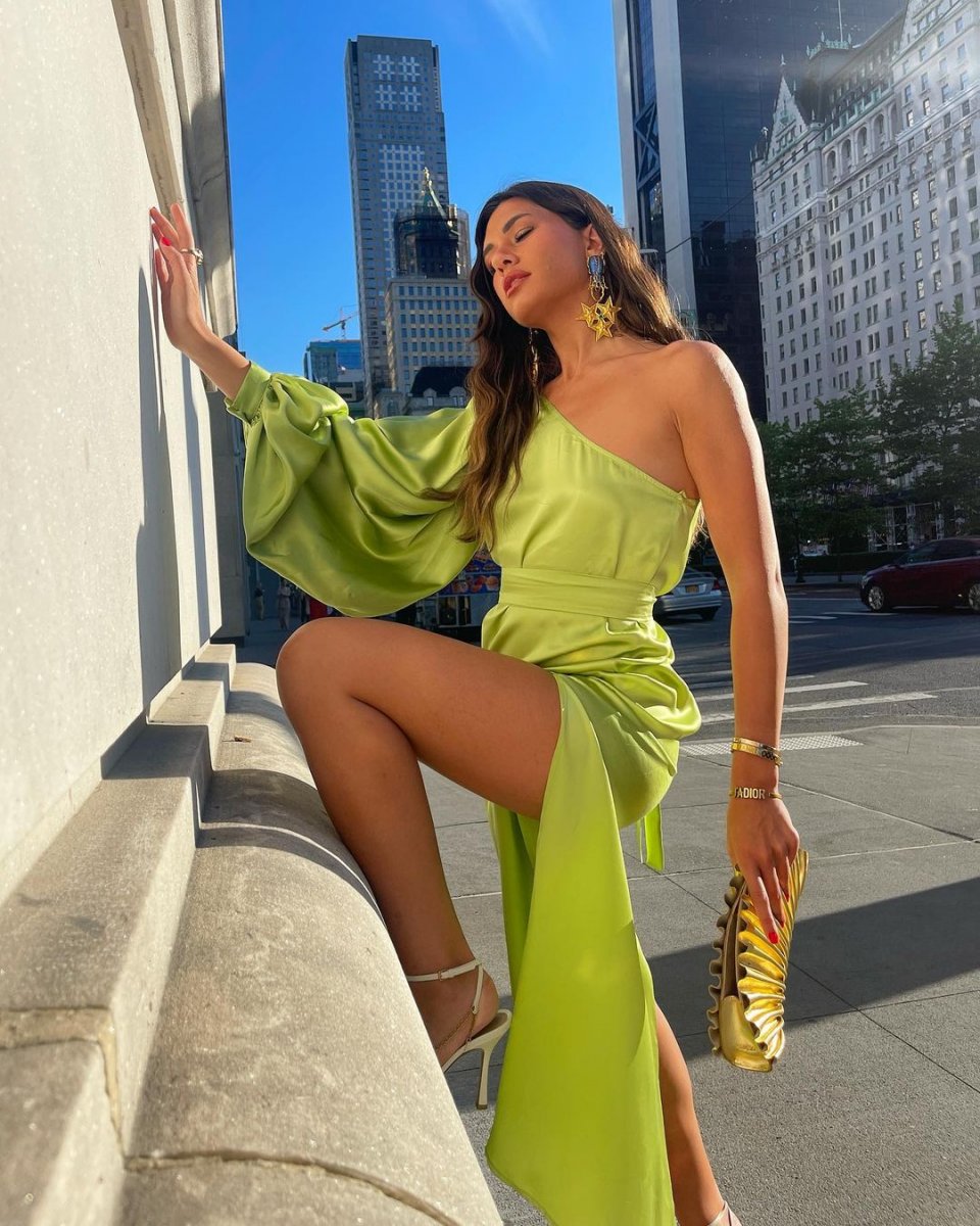 Saten yeşil elbisesiyle derin yırtmacını ortaya çıkaran pozlar veren Sibil Çetinkaya, “sezonu açtık” notunu yazdı.