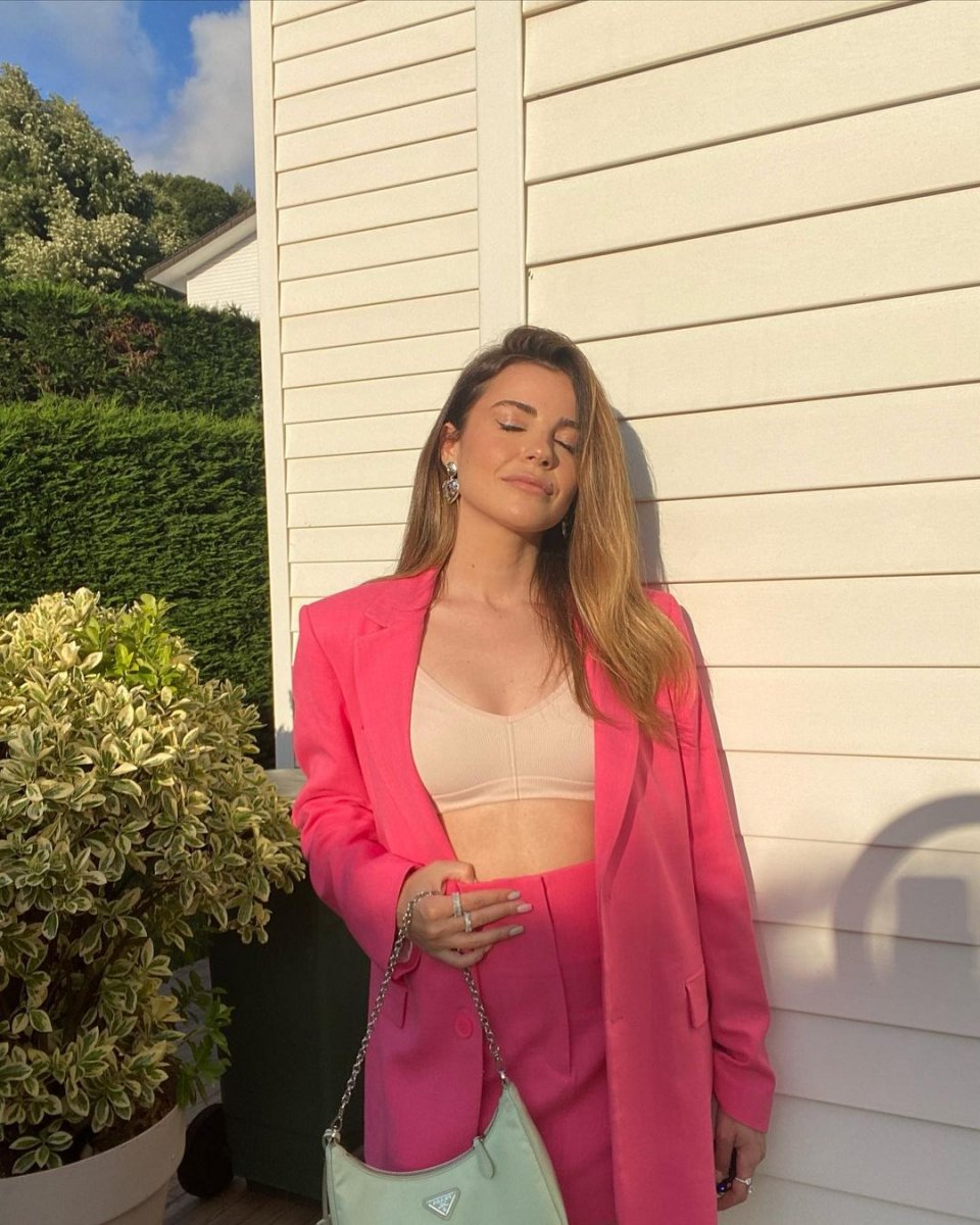 Davette pembe ceket ve etek takım tercih eden Ezgi Eyüboğlu, dekolteli büstiyeri ve eteğiyle peş peşe poz verdi.