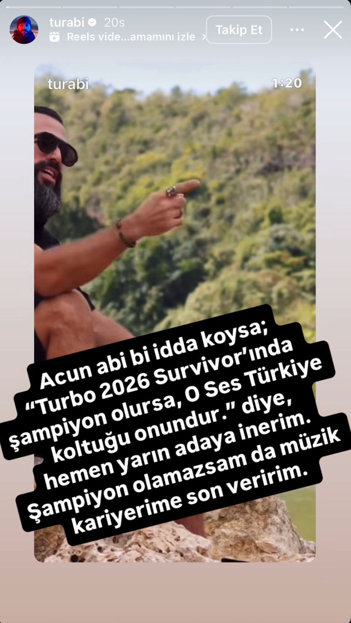 “Acun abi bir iddia koysak; ‘Turbo 2026 Survivor’ında şampiyon olursa, O Ses Türkiye koltuğu onundur.’ deseler, yarın adaya inerim. Şampiyon olamazsam da müzik kariyerime son veririm.”