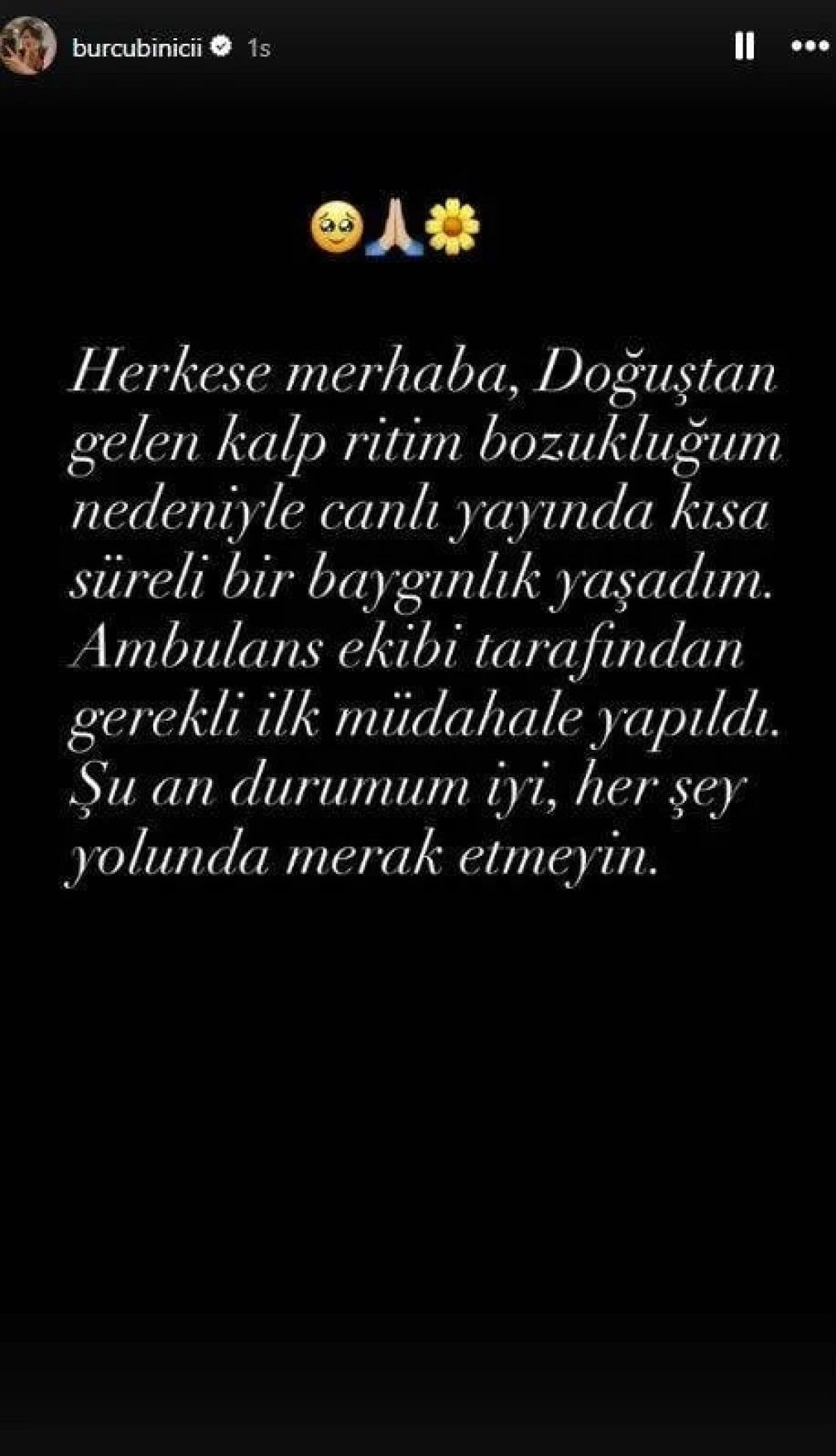 Binici yaptığı açıklamada, “Herkese merhaba, doğuştan gelen kalp ritim bozukluğum nedeniyle canlı yayında kısa süreli baygınlık yaşadım. Ambulans ekibi tarafından gerekli ilk müdahale yapıldı. Şuan durumum iyi, her şey yolunda merak etmeyin” dedi.