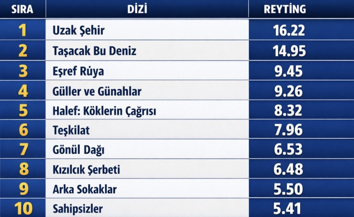 Listenin zirvesine 16.22 reytingle Uzak Şehir yerleşti. Başarılı senaryosu ve artan izleyici ilgisiyle dikkat çeken dizi, haftanın en çok izlenen yapımı olmayı başardı.