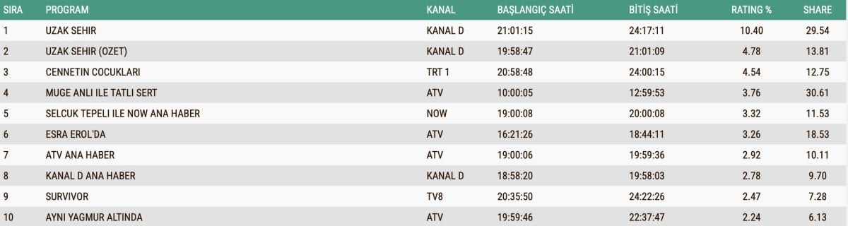 Yayınlandığı ilk günden bu yana istikrarlı grafiğini sürdüren Kanal D’nin rekortmen dizisi Uzak Şehir, TOTAL, AB ve 20+ABC1 izleyici gruplarında açık ara farkla zirvede yer aldı.