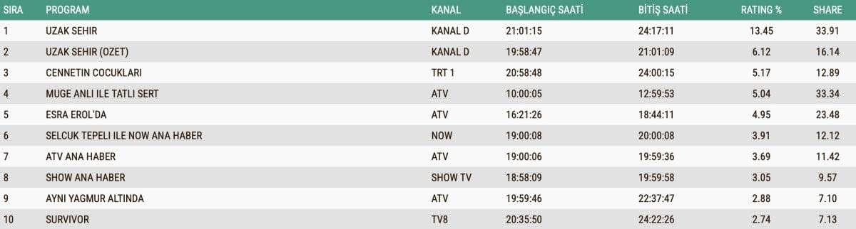 9 Şubat Pazartesi günü tüm kategorilerde birinci sırayı Uzak Şehir kaptı. Aynı Yağmur Altında dizisi ise 10. sıraya yerleşti.