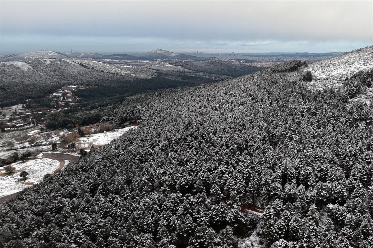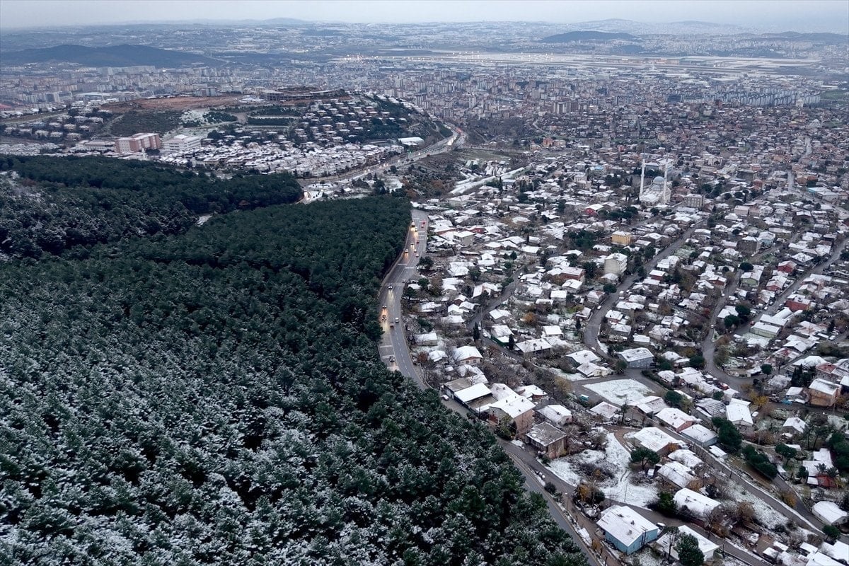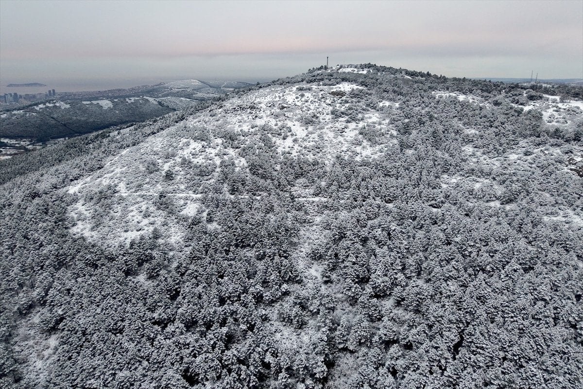 Kar yağışıyla birlikte İstanbul’un yüksek noktalarından biri olan Aydos Ormanı tamamen beyaza büründü. Ağaçların ve orman yollarının karla kaplanmasıyla birlikte bölgede kış manzaraları oluştu.