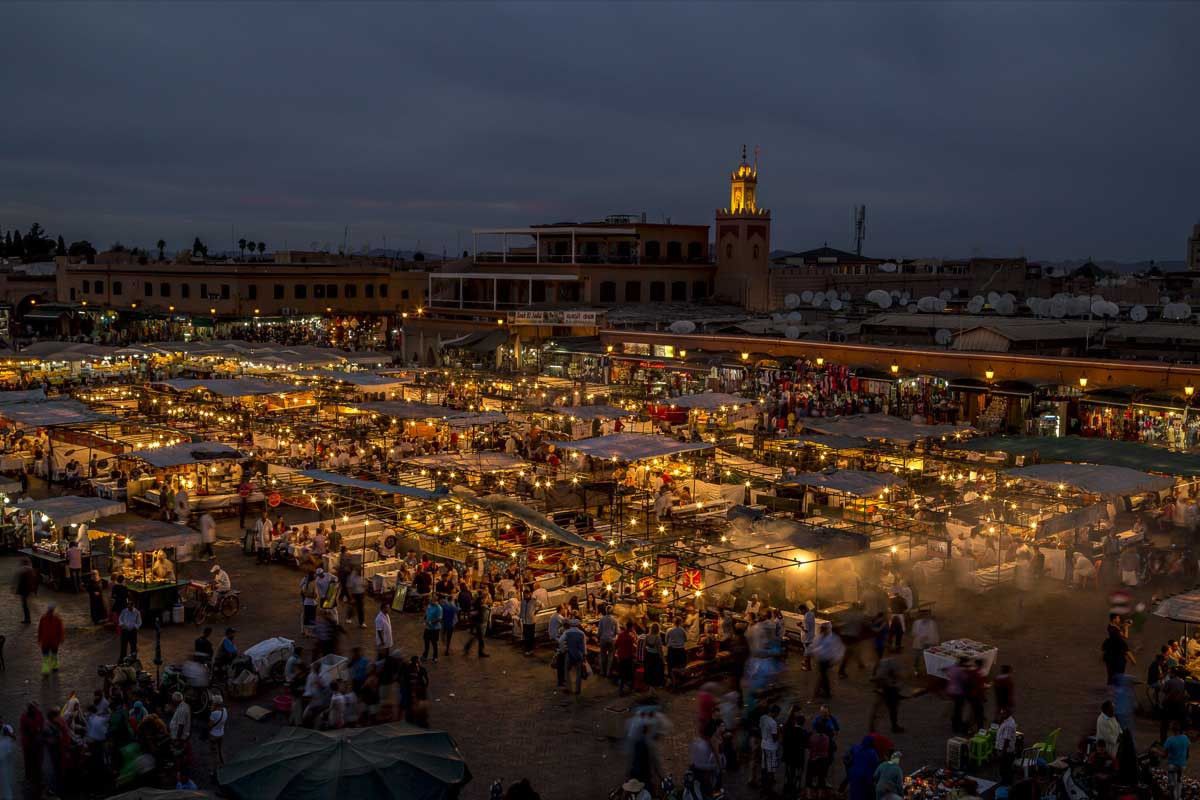 Yılan oynatıcılar, meydan hikayecileri ve akşamın sisli dumanı burada ritmi belirliyor.