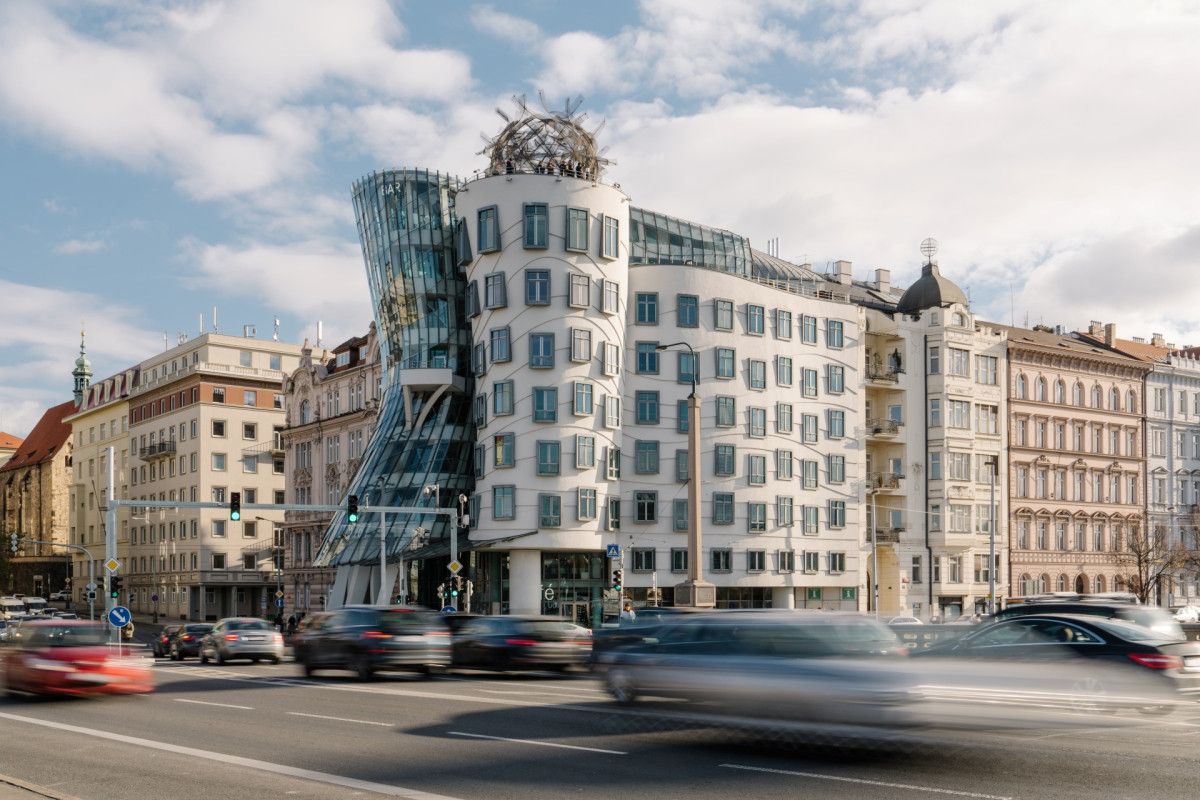 Frank Gehry ve Vlado Milunić’in iş birliğiyle ortaya çıkan Dancing House, Prag’ın tarihi dokusuna kontrast oluşturan modern bir yapı.