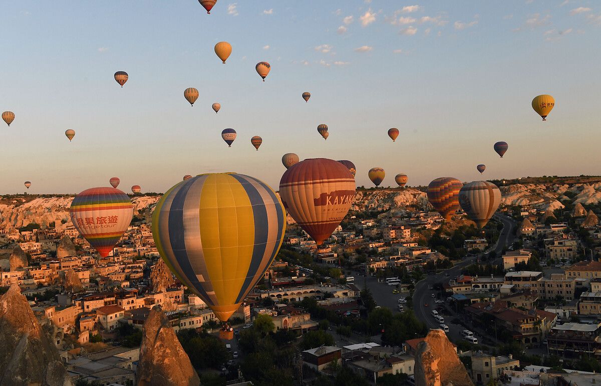 Sabahın erken saatlerinde gökyüzünü süsleyen sıcak hava balonları, renklerin uyumu ve hareketiyle her kareyi canlı bir tabloya dönüştürür.