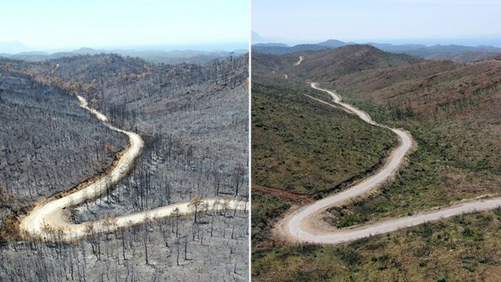 Yangının hemen ardından çekilen fotoğrafla bugün alınan görüntü yan yana getirildiğinde yaşanan çarpıcı gelişme gözler önüne seriliyor.